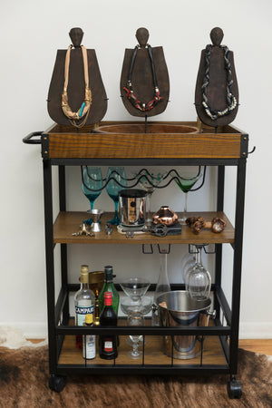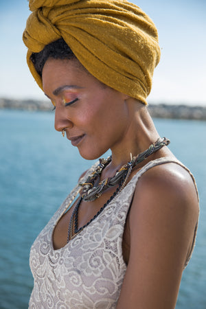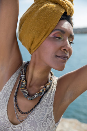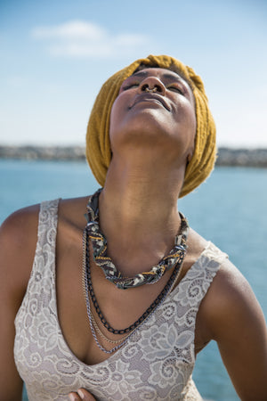 This layered necklace is adorned with braided leather and chains of precious metals to give it a luxurious 3-dimensional look as it hangs on the neck. It comes in a variety of colors and will add interest to any outfit....